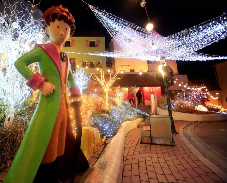 Về đêm toàn bộ công viên lấp lánh ánh đèn hoa lệ trải trên những ngôi nhà kiểu Pháp, ánh sáng đèn được thiết kế theo bối cảnh trong câu chuyện hoàng tử nhỏ và giáng sinh cho bạn cảm giác giống như đang du lịch đến đất nước của truyện tranh. Xin mời các bạn đến với Petite France – nơi toàn bộ ngôi làng thay đổi theo những bức ảnh đặc biệt.